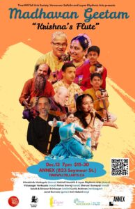 Madhavan Geetam brings together a multigenerational and multicultural ensemble of artists to explore the originality, beauty and depth that is offered by Bharatanatyam and Carnatic music. The repertoire will be composed of age-old compositions of the great composers of South India (such as Thyagaraja, Swati Tirunal), given shape and form by a number of dancers led by Vaishali Koushik of Laaya Rhythmic Arts and Himabindu Vankayala (with support from Anuradha Rao and Shantaleela Rao Andrews). Of special note in this program are several compositions that feature the poetry of the late Variath Madhavan Kutty and the music of Vidyasagar Vankayala. Madhavan-ji was a great supporter and inspiration to many of the artists in this program and this will be a fitting tribute to his legacy and memory.